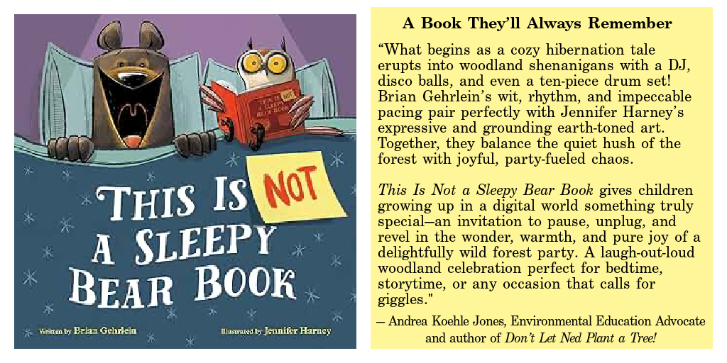 “Written with wit, warmth, and hilarious charm, Brian’s words pair perfectly with Jennifer’s calming and grounding earth-toned art. She beautifully balances the quiet hush of the woods with the joyful, party-fueled chaos inside Bear’s den. Together, they offer something especially meaningful for children growing up in a digital world—a gentle invitation to slow down, look closely, and feel the laughter and warmth of the forest. Gehrlein and Harney create pure read-aloud magic—perfect for bedtime, storytime, or any moment that calls for laughter.” — Andrea Koehle Jones, Children’s Book Author and Environmental Education Advocate